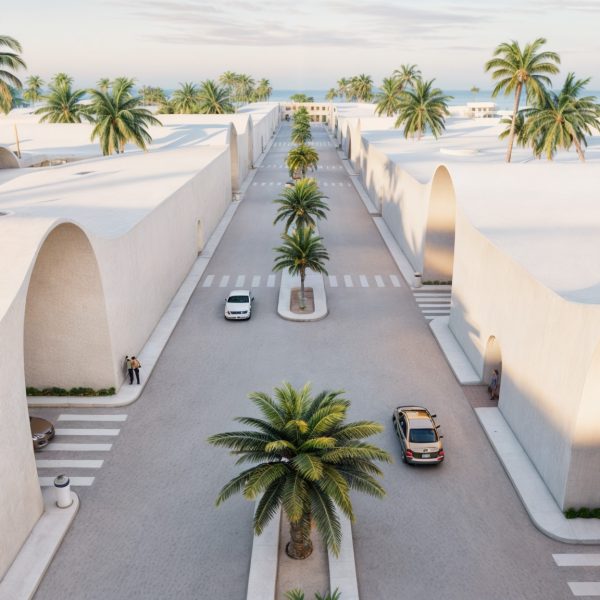 The architecture is defined by its fluid, wave-like structures that create a seamless connection between the built environment and the natural surroundings. These unique forms not only provide an eye-catching visual appeal but also enhance functionality by optimizing natural ventilation and passive cooling, making the town ideal for its coastal setting.