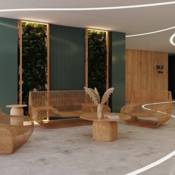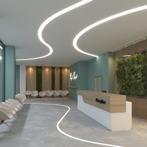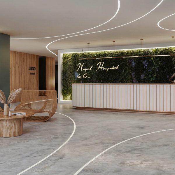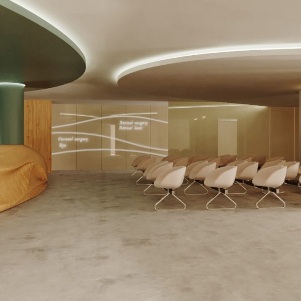 Subtle curvatures in the ceiling design, combined with soft, integrated lighting, guide visitors through the space intuitively while adding a touch of elegance. Thoughtfully selected materials and furniture, such as woven seating and natural accents, create a sense of harmony and balance, making the hospital feel more like a sanctuary than a clinical environment.